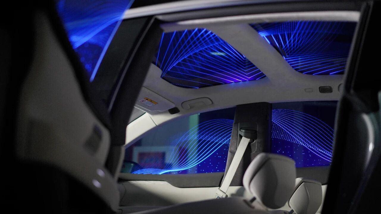 梅赛德斯-奔驰的数字流星雨大灯可在路面上投射警示图案,劳斯莱斯星光顶篷用1340根光纤编织银河,极氪X的Ice Block冰晶氛围灯将北欧极光搬进座舱。这些创新揭示了一个趋势:灯光正在重构人与车的对话方式,设计师利用了内饰面、绒布顶、显示屏、甚至是以路面做投影屏,充分挖掘每一个可以承载光影美学的表面。但始终未能突破玻璃介质的物理桎梏。